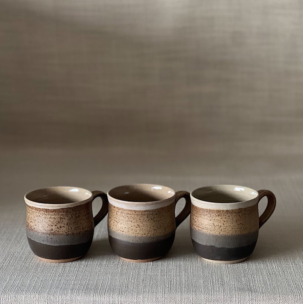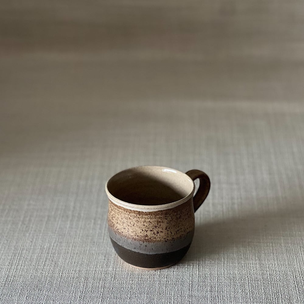A glossy clear glaze on the inside and a matt black and brown glaze on the outside.