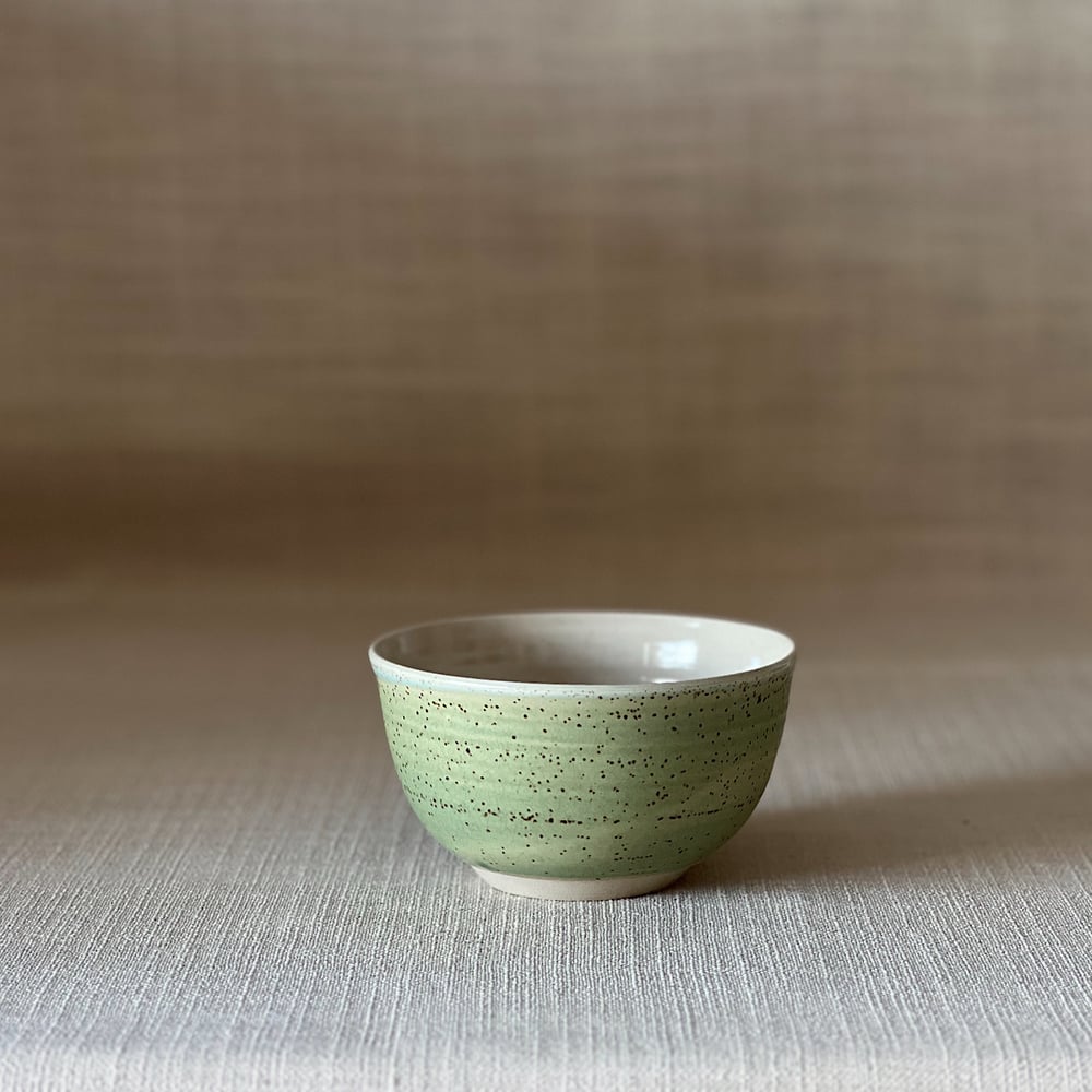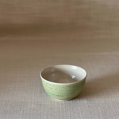 Speckled clay with glossy clear glaze inside and matt green glaze on the outside.