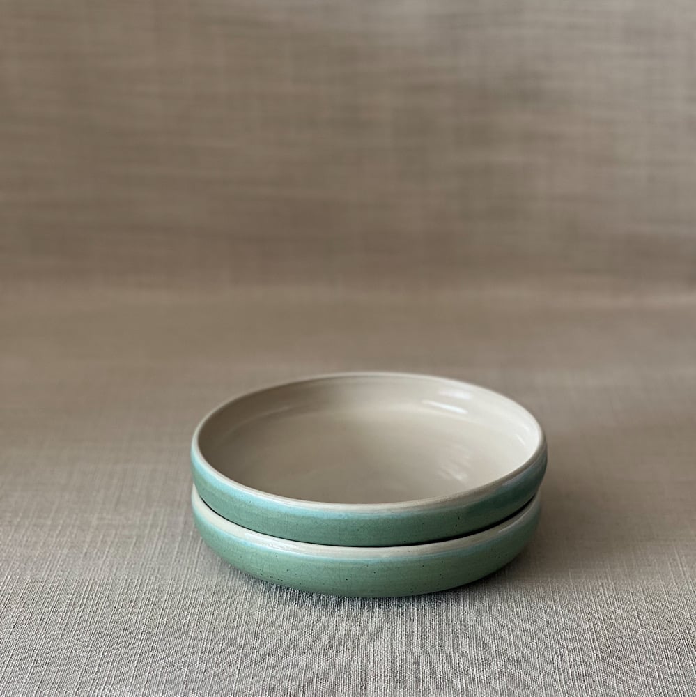 Lightly speckled clay with clear glaze on the inside and a matt green glaze on the outside.