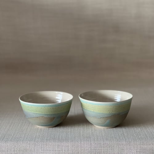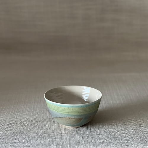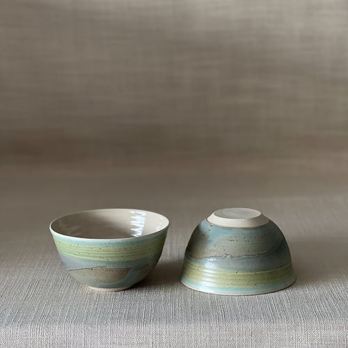 Speckled clay with clear glaze on the inside and matt green and blue glaze on the outside.